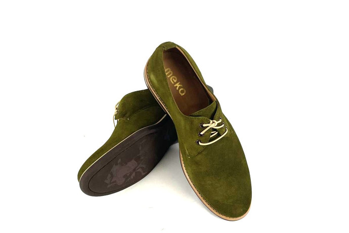 Skóra naturalna welurowa, kolor: zielony, podeszwa z wysokogatunowej mikrogumy, podszewka ze skóry koziej.